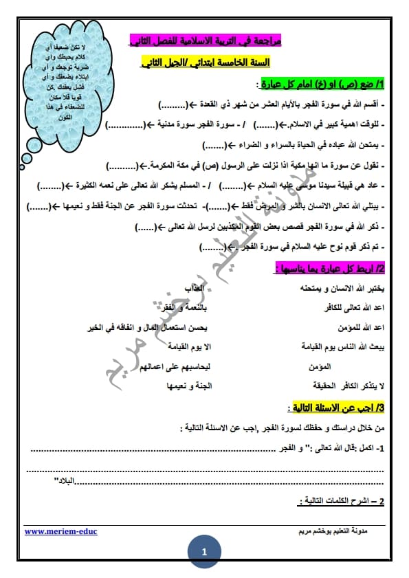 مراجعة شاملة في التربية الاسلامية للسنة الخامسة 5 ابتدائي الفصل الثاني الجيل الثاني