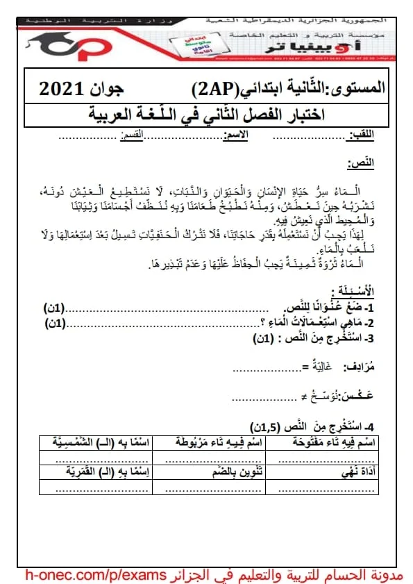 تحميل اختبارات السنة الثانية ابتدائي الفصل الثاني في اللغة العربية 2020 -2021 مع الحلول رقم 04
