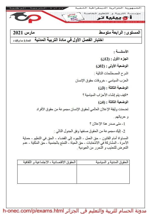 أن نضع بين أيديكم وتحت تصرفكم ملفا خاصا بمستوى السنة الرابعة متوسط، ويتمثل في اختبار التربية المدنية للسنة الرابعة متوسط الفصل الاول وفق مناهج الجيل الثاني 2020 -2020 هذا الملف على شكل pdf قابل للتعديل والطباعة.