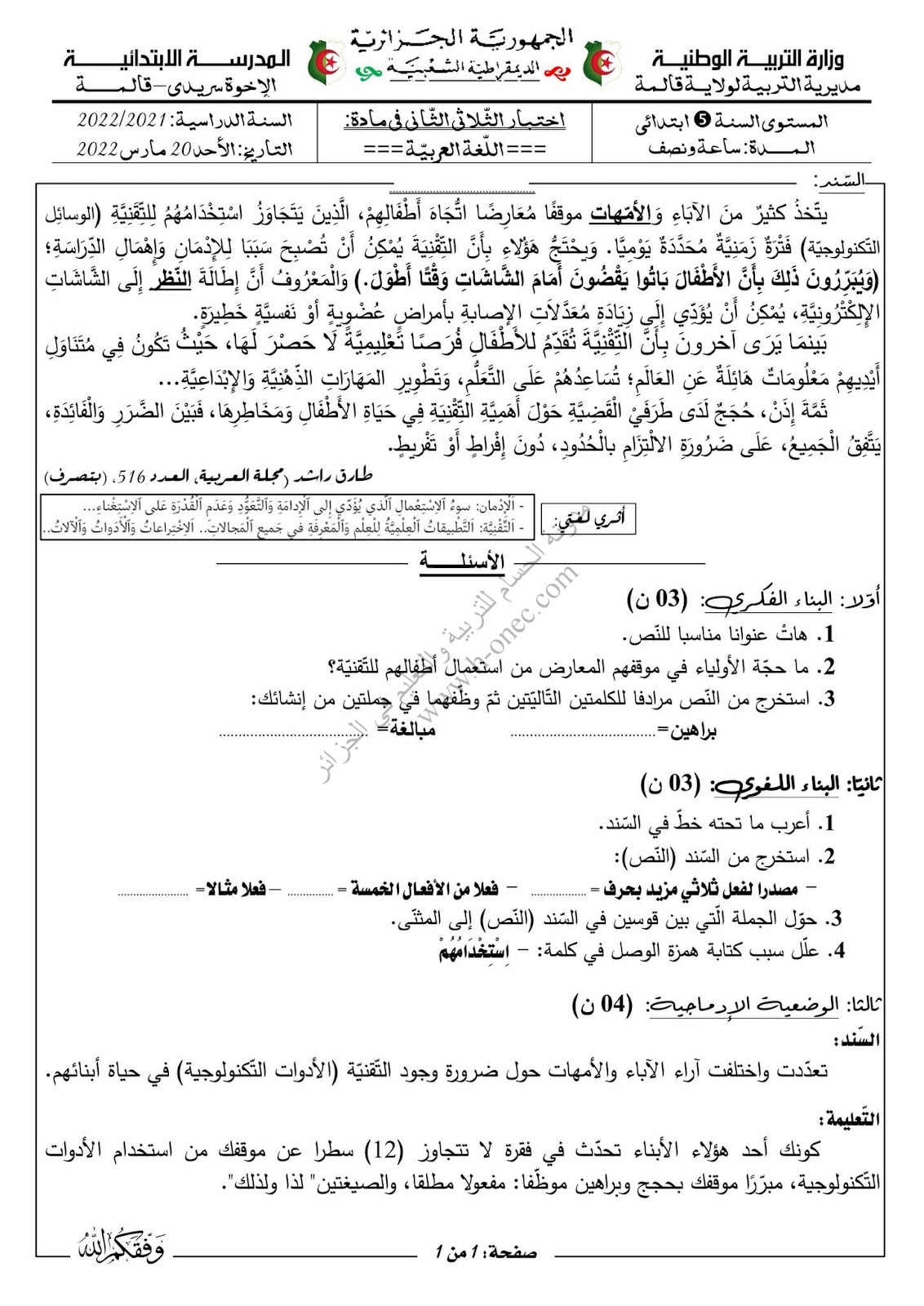 أن نضع بين أيديكم وتحت تصرفكم ملفا خاصا بمستوى السنة الخامسة ابتدائي، ويتمثل في اختبار اللغة العربية للسنة